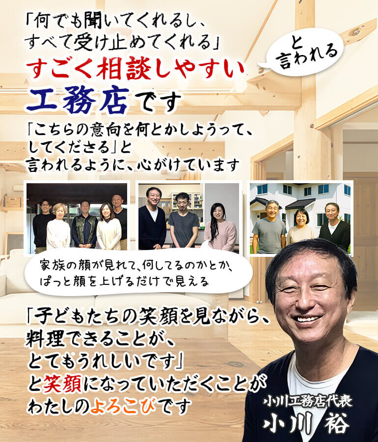 こんにちは!「何でも聞いてくれるし、すべて受け止めてくれる」と言われる、すごく相談しやすい工務店の小川裕(おがわひろし)です。